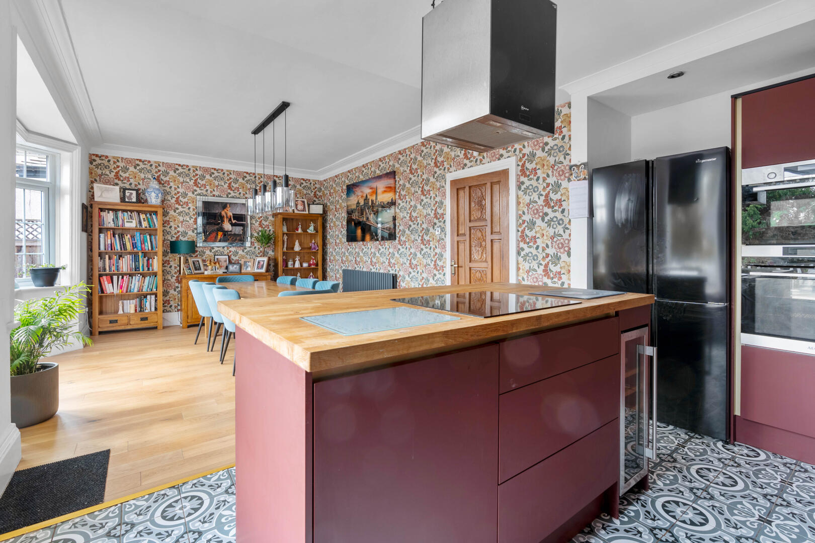 Step inside and you’ll find a welcoming entrance hallway with a convenient downstairs WC. The heart of the home is the open-plan kitchen/diner, complete with a stylish breakfast island featuring a built-in Zanussi hob and overhead Neff extractor. Fully fitted with quality built-in appliances, this kitchen is designed for both everyday living and entertaining. Elegant French doors open out onto a landscaped, split-level rear garden, perfect for relaxing or hosting friends and family.