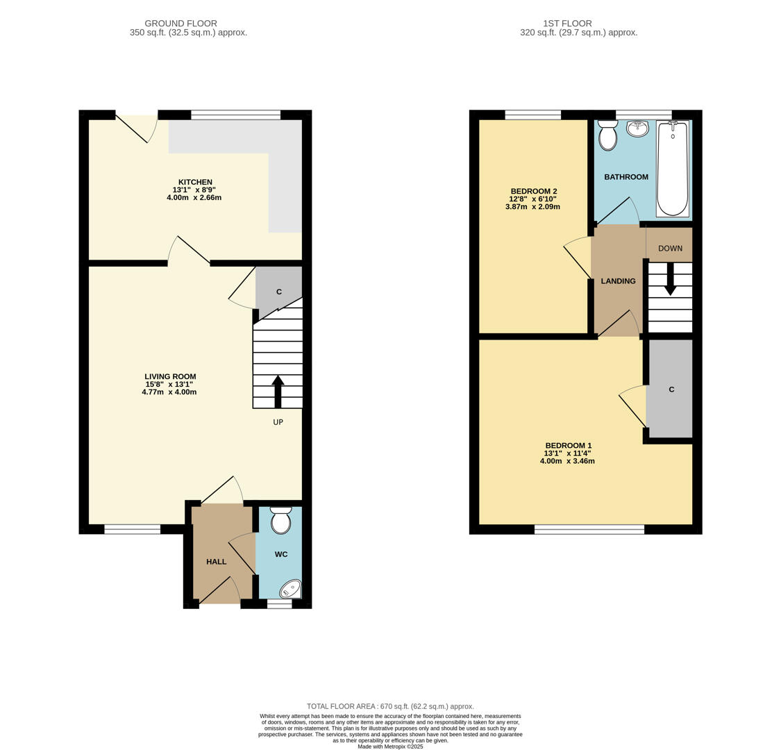 The modern kitchen offers ample storage and workspace, ideal for both everyday living and entertaining guests. Upstairs, there are two well-proportioned bedrooms, along with a neat and contemporary bathroom.
