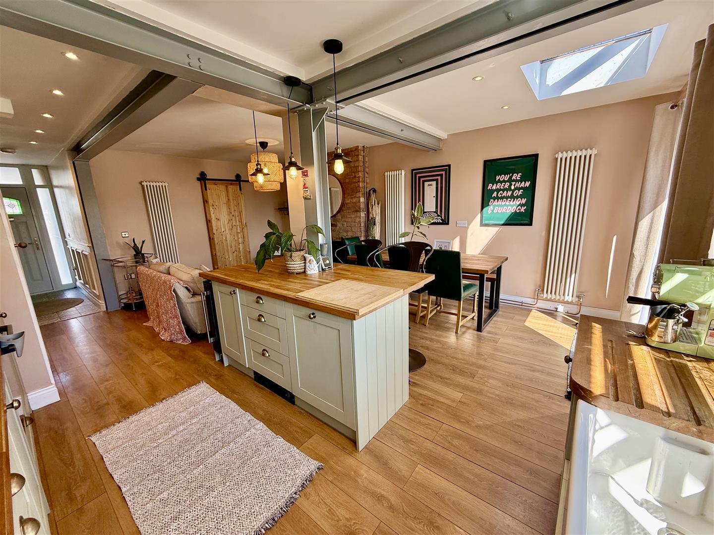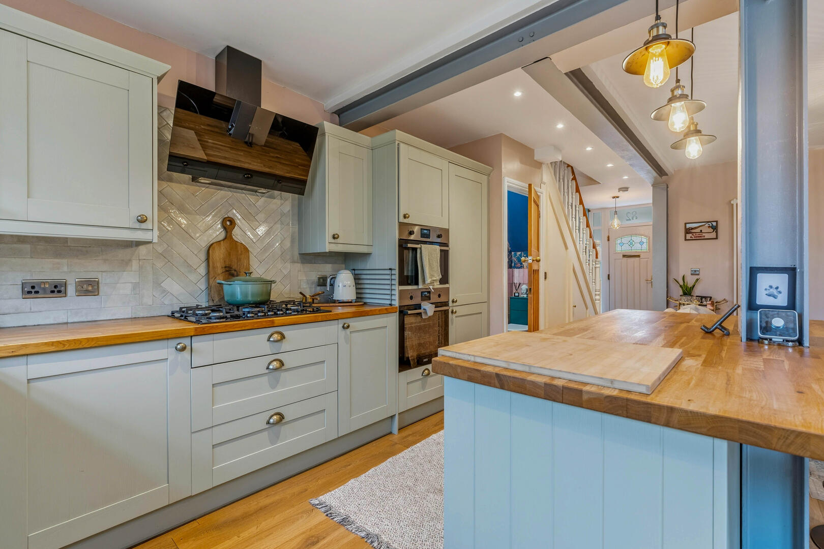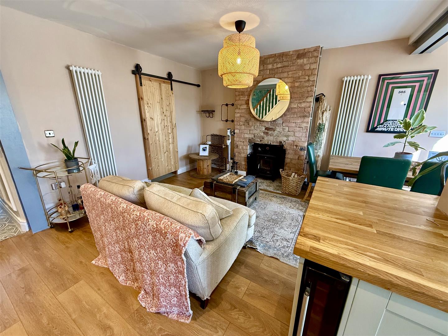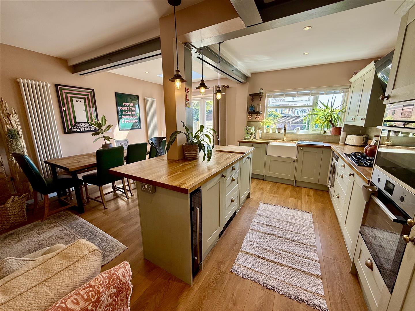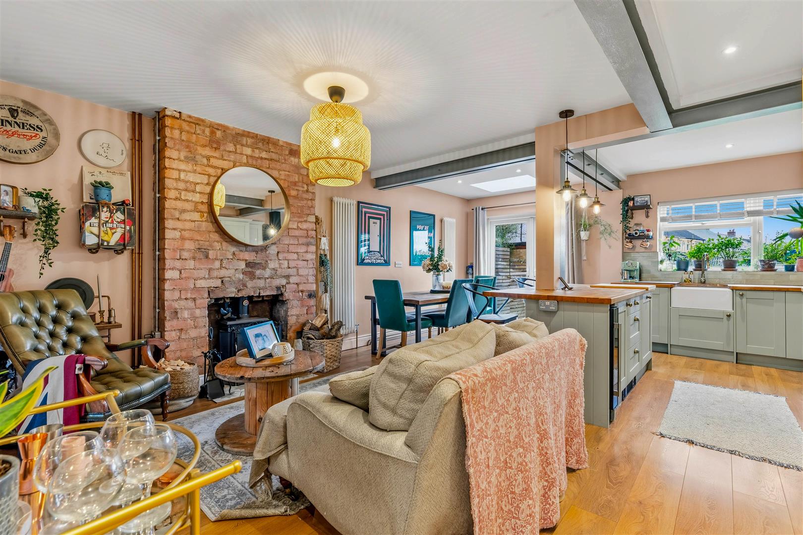 Upon entering, you are welcomed by a bright and inviting entrance hallway leading through to the true heart of the home — a beautifully extended kitchen/diner. Bursting with character, this impressive space benefits from a skylight that floods the room with natural light, fitted appliances, and a charming log burner which adds both warmth and a contemporary touch. The ground floor also offers a convenient downstairs WC. To the front of the property, there is a well-proportioned lounge, thoughtfully separated from the kitchen, featuring a bay window that enhances the sense of space and light.