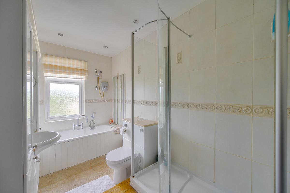 Upstairs, you’ll find three comfortable double bedrooms – a real bonus for families or those wanting space for a home office or guest room. The large family bathroom is fitted with both a full-size bath and a separate shower enclosure, plus useful built-in storage to keep things tidy.